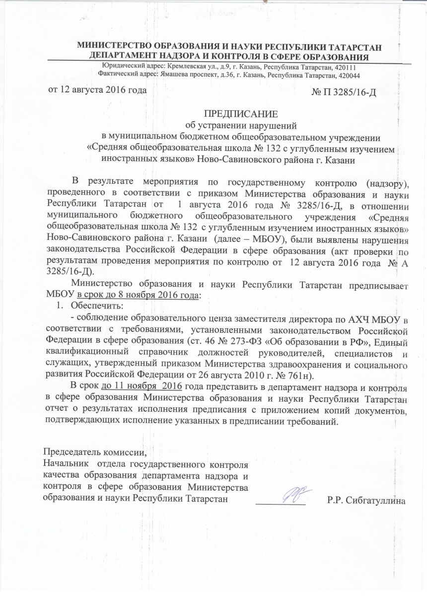 - Предписание от 12.08. 2016г. №П 3285/16-Д