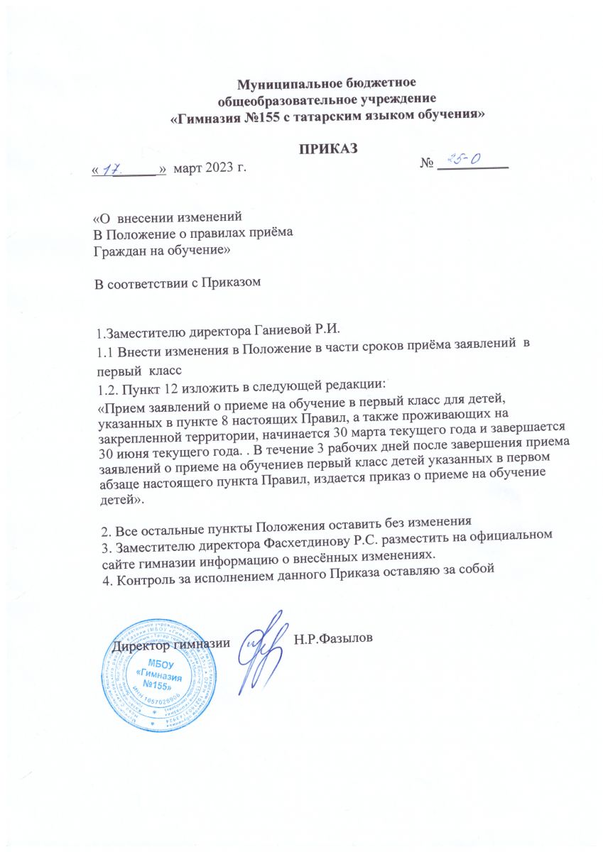 ПРИКАЗ "О внесении изменений в Положение о правилах приема Граждан на обучение"