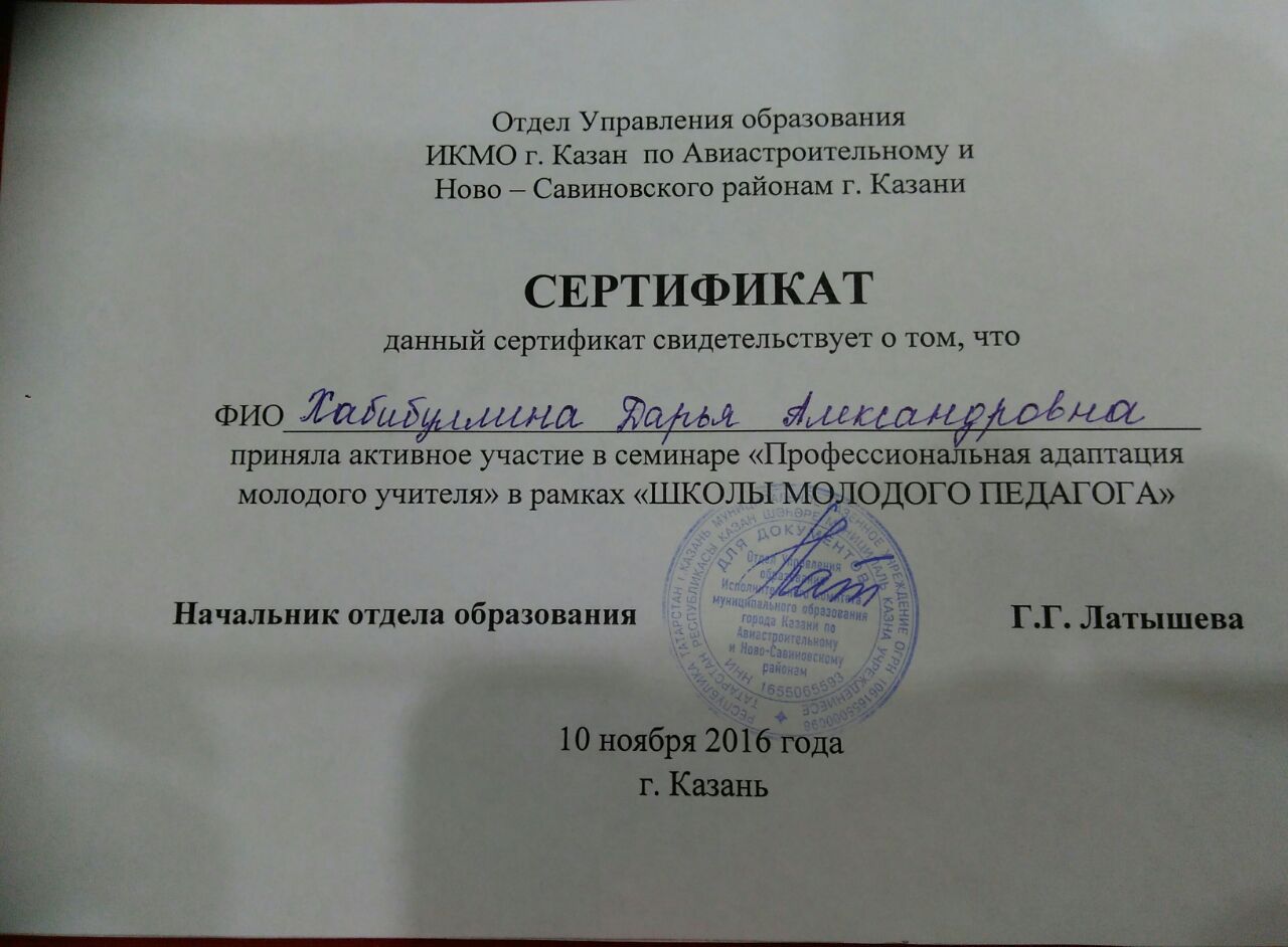 Учитель английского языка - Хабибуллина Д.А. приняла участие в семинаре молодых педагогов "Профессиональная адаптация молодого учителя" , представив свой мастер-класс.