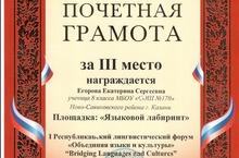Языковый лабиринт 03.03.2014 Егорова Екатерина, ученица 8В класса награждена Почетной грамотой за III место I Республиканского лингвистического форума "Объединяя языки и культуры" (Площадка "Языковый лабиринт")!!! Поздравляем!