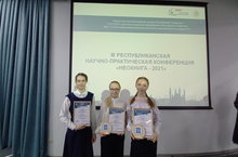 Награждение призеров III Республиканской научно-практической конференции "Неокнига" учащихся 8В кл. Ю. Зарина, Анастасия О, учащейся 10 А кл. Т. Ренаты.