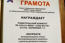 "Секреты дружного класса" 25.12.2019 Поздравляем команду "Вместе" 7В класса (классный руководитель - Каримова Г.Т.), лауреатов конкурса "Секреты дружного класса". В классе нашем доброта Поселилась навсегда! Очень дружно мы живем, Дружба крепнет с каждым днем! Помогаем мы друг другу И в учебе, и в труде, Много конкурсов различных, Успеваем мы везде!