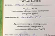 Поздравляем команду школы №170 занявших I место в районном конкурсе юных краеведов "Моя Родина - Татарстан!", посвященном 100-летию ТАССР". (руководитель - Волкова Н.В.)