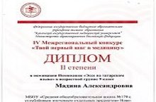 Поздравляем Д. Мадину, ученицу 9 класса с призовым местом в IV Межрегиональном конкурсе "Твой первый шаг в медицину" в номинации "Эссе на татарском языке". Желаем дальнейших успехов!