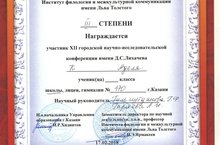 17 февраля 2018 года на базе школы №62 прошла XII городская научно-исследовательская конференция имени Д.С.Лихачева. Ученики нашей школы достойно выступили на конференции: К. Аделя награждена дипломом III степени, Г. Гульшат награждена грамотой. Поздравляем наших победителей и желаем дальнейших успехов!