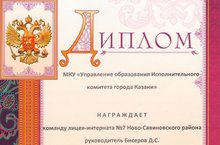 МКУ «Управление образования Исполнительного комитета города Казани» награждает команду лицея-интерната №7 Ново-Савиновского района под руководитель Бисеров Денис Сергеевич Призера VIII Чемпионата г.Казани по интеллектуальным играм «Что? Где? Когда?» сезона 2013-2014 средняя лига (8-9 классы)