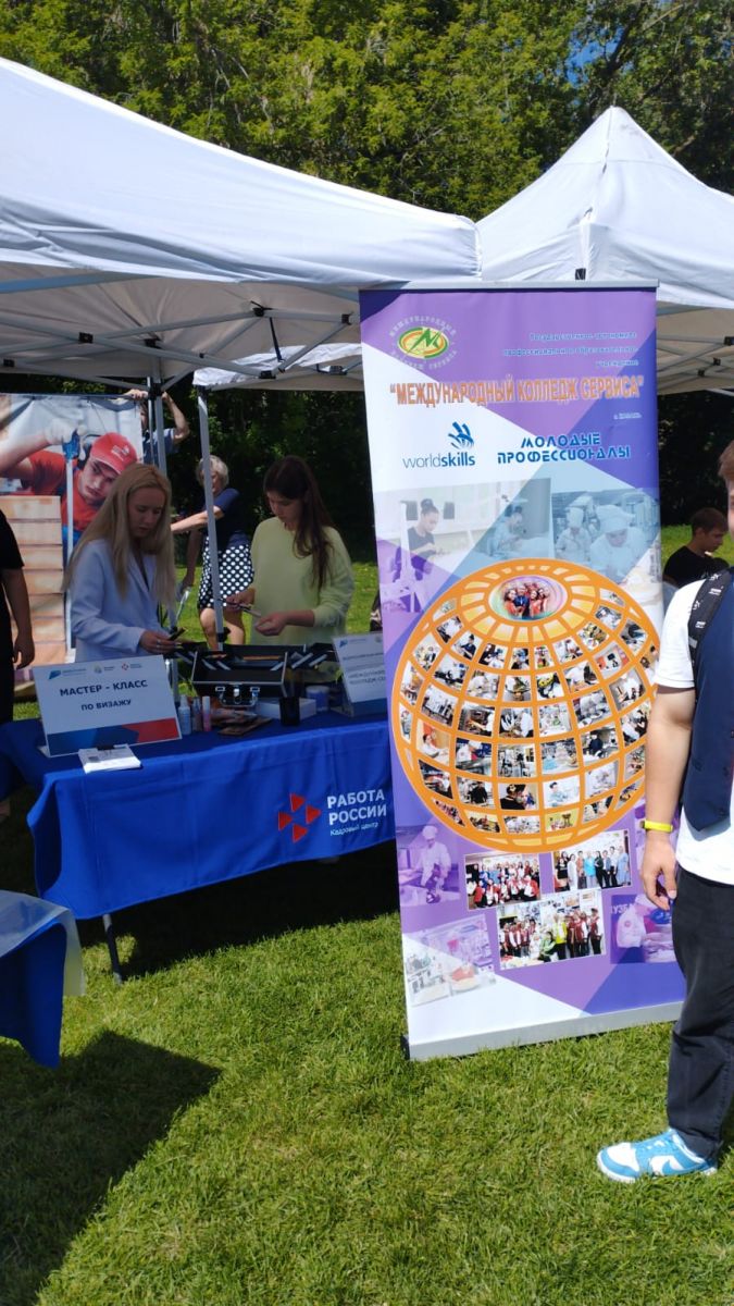Студенты Международный колледж сервиса Буржонова Самира и Давлетьяров Эрик в рамках ярмарки провели работу по популяризации рабочих профессий по образовательным программам колледжа, а Гордеева Арина показала мастер-класс по визажу.