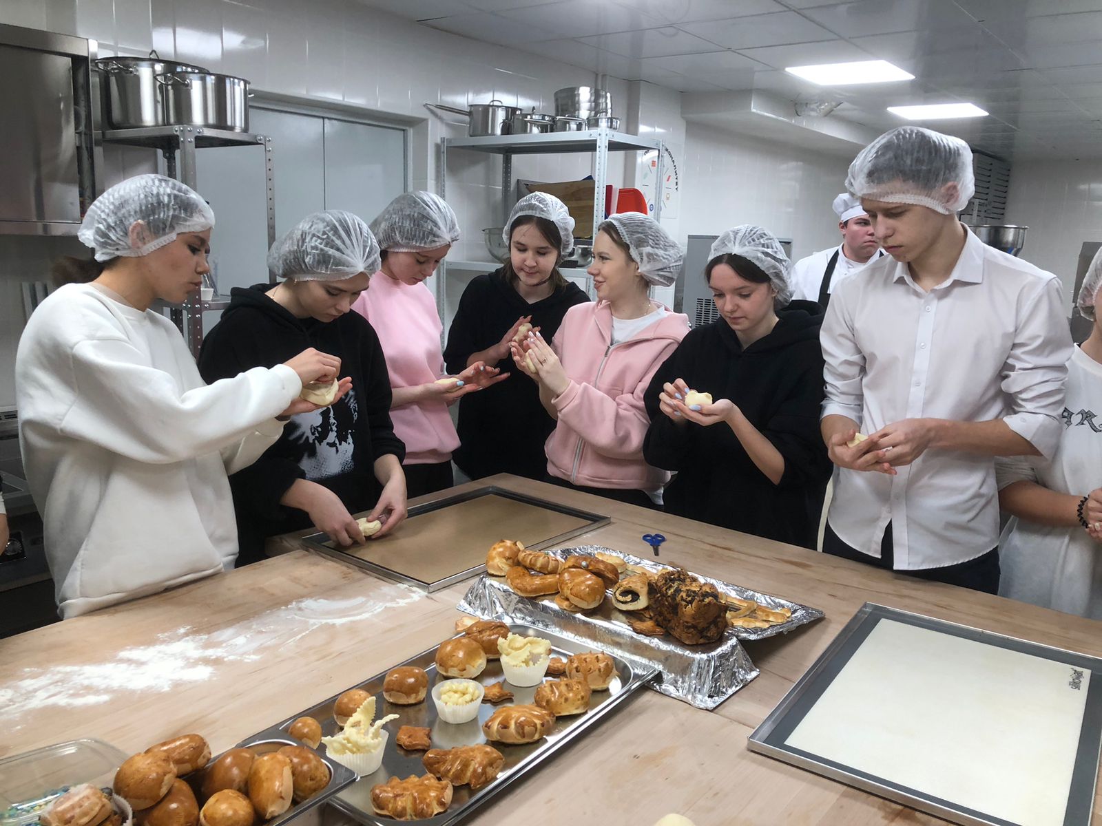 Амбассадоры «Профессионалитета» поделилась впечатлениями о студенческой жизни в колледже и провела экскурсию по лабораториям. В лаборатории практико-ориентарованной подготовки учащиеся школ могли не только увидеть, как работает автоматизированная линия по приготовлению мелкоштучных хлебобулочных изделий, но и самим поучаствовать в мастер-классе.