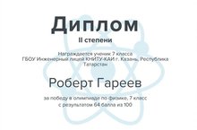 Дипломом II степени за победу в Международной онлайн-олимпиаде "Фоксфорда" по физике награжден лицеист 7А класса Роберт Гареев! Поздравляем! Выражаем благодарность учителю Диляре Альбертовне.