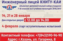 Инженерный лицей КНИТУ-КАИ для одаренных детей объявляет дополнительный набор учащихся 7-10 классов на II полугодие 2016/2017.
