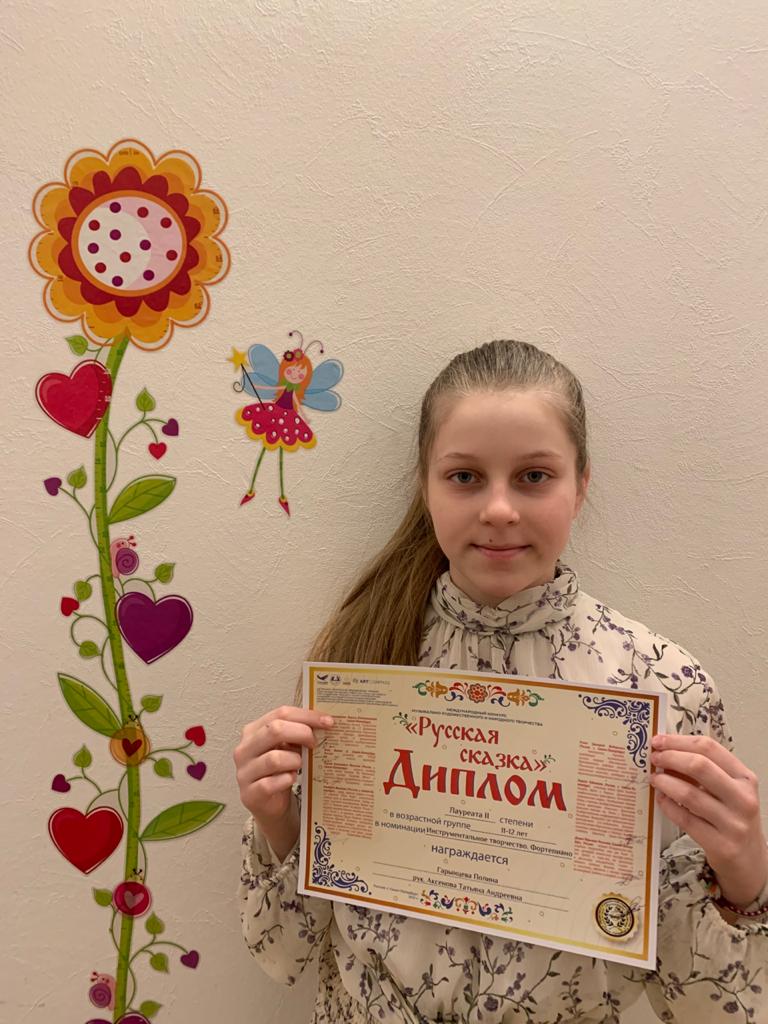 Международный конкурс - фестиваль "Русская сказка" г. Санкт-Петербург Гарынцева Полина - лауреат II степени Поздравляем Полину и её преподавателя Аксёнову Татьяну Андреевну!
