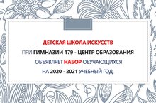 Детская школа искусств при Гимназии 179 - центр образования объявляет набор обучающихся на 2020 - 2021 учебный год.Сроки приёмных прослушиваний- 24, 25, 26, 27 августа 2020 года.Кабинет 312, время с 17.00-19.00.Подготовить 2 песенки и стихотворение.При себе иметь копию свидетельства о рождении и паспорт. -