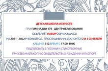 Детская школа искусств при Гимназии 179 - центр образования объявляет набор обучающихся на 2021 - 2022 учебный год. Прослушивание состоится 2 и 3 сентября в кабинете 312, время с 17.00-19.00. Подготовить 2 песенки и стихотворение. При себе иметь копию свидетельства о рождении и паспорт.