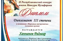 Поздравляем Ханнанова Радмира - Дипломанта III степени II Республиканского конкурса имени Мансура Музаффарова в номинации "Народные инструменты".