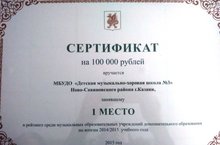 МБУДО "Детская музыкально-хоровая школа №3" заняло 1 место в рейтинге среди музыкальных образовательных учреждений дополнительного образования по итогам 2014/2015 учебного года. Наша школа признана лучшей среди музыкальных школ города, и учреждению присужден сертификат на 100 тысяч рублей.