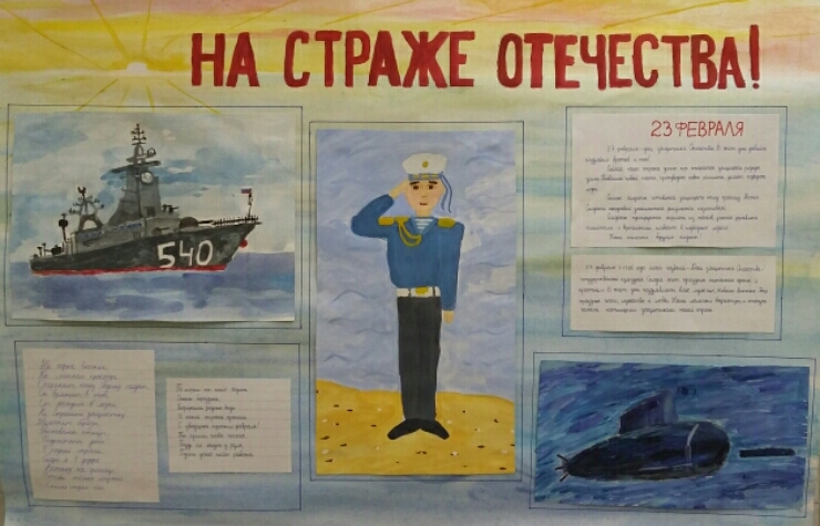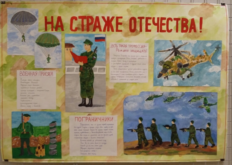 К этому государственному празднику, который, кроме России, отмечают в Белоруссии, Таджикистане и Киргизстане, ученики преподавателя Венеры Робертовны Уразовой (отделение художественных дисциплин) подготовили стенгазету «На страже Отечества».