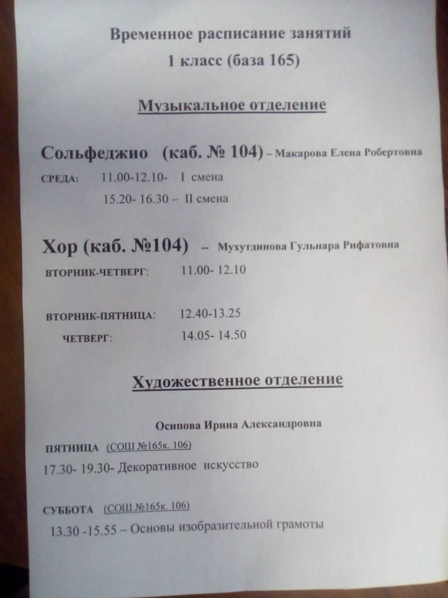 Временное расписание занятий ДМШ № 11(СOШ 165) Музыкальное отделение