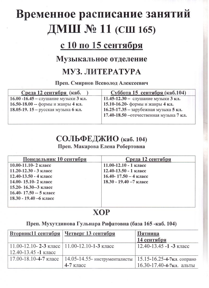 Временное расписание занятий ДМШ № 11 (СШ 38 и 165) с 10 по 15 сентября