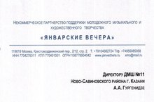 Директору нашей школы Анжелле Ахмедовне Гургенидзе пришло Благодарственное письмо от организаторов фестиваля "Январские вечера" (г. Москва) . Лучшие работы учащихся нашей школы украсили буклет фестиваля и стали частью видеоряда IX Январских вечеров.
