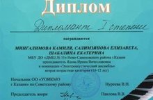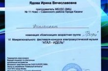 Поздравляем Сайдашеву Саадат, ставшую в феврале Лауреатом II степени на Всероссийском заочном музыкальном конкурсе "Талантоха", Дипломантом II степени на Всероссийском заочном музыкальном конкурсе "Мелодинка", ставшей Победителем (III место) на заочном творческом конкурсе "Рассударики" в номинации "Рисунок", а также ставшую Дипломантом I степени на межрегиональном очном конкурсе "Вдохновение" ! Поздравляем преподавателей, готовивших Саадат к победам - Ирину Вячеславовну Ядову и Елену Анатольевну Белякову!