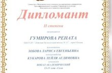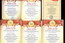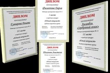 Лауреат 2 степени Белова Ярослава, Шушкова Полина, Зиганшина Эмилия и вокальный ансамбль "Серебряный голос" (Закирова Самира, Харчик Ульяна, Тимофеев Ярослав, Хафизова Азалия, Белова Ярослава, Гридина Анна, Вагизов Камиль, Зиганшина Эмилия)дипломант 1 степени Ак Алина - руководитель Мухутдинова Г. Р., концертмейстер Кукарова Л. А. -