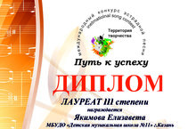 Поздравляем Якимову Елизавету - Лауреата III степени, учаастницу II Международного конкурса "Осенний звездопад" Конкурс" Путь к успеху"