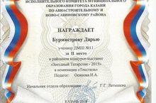 Поздравляем Бурмистрову Дарью с Грамотой за 2 место в районном конкурсе-выставке "Звездный Татарстан - 2015", класс преподавателя Осиповой И.А.