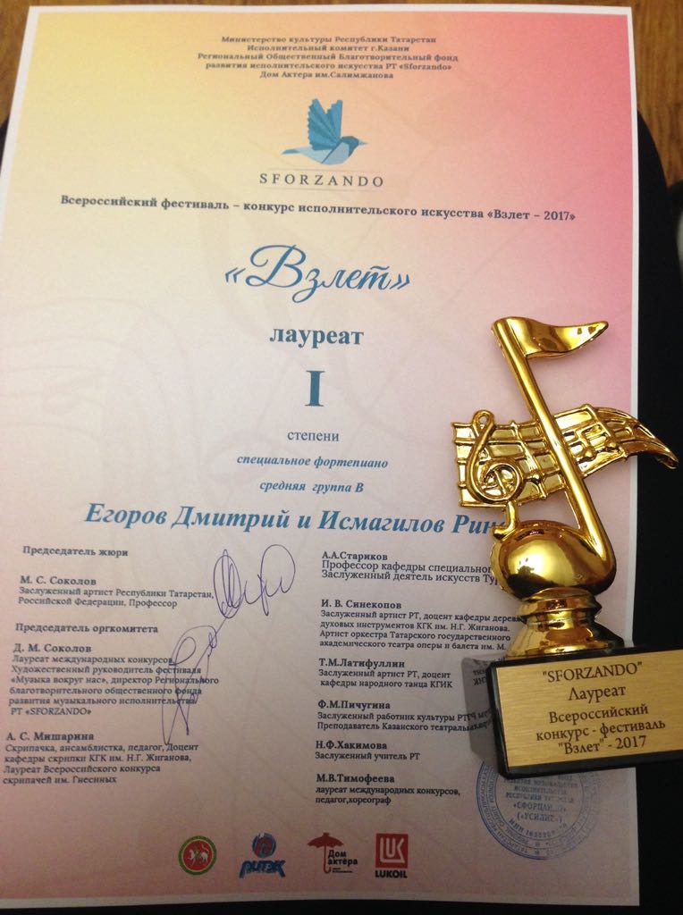 Поздравляем Исмагилова Рината и Егорова Диму выступивших 7 апреля на Международном конкурсе "Взлёт" в номинации "Фортепианный дуэт" и ставших Лауретами I степени. Кроме этого, выступление мальчиков и работа педагога Петровой Ольги Евгеньевны получили высокую устную оценку Жюри, состоявшего из преподавателей Казанской Государственной консерватории и Средней специальной музыкальной школы при Казанской государственной консерватории им. Н. Г. Жиганова.