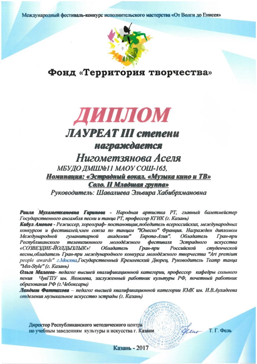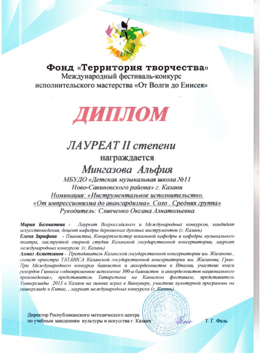 Опубликовано: 09.04.20178 апреля в Казани состоялся Международный конкурс "От Волги до Енисея". Успешно выступили на конкурсе учащиеся нашей школы Мингазова Альфия, ученица Оксаны Анатольевны Сливченко, ставшая Лауреатом II степени; Нигометзянова Аселя, ученица Эльвиры Хабибрахмановны Шавалиевой, ставшая лауреатом II степени, Исаев Иван, ученик Эльвиры Хабибрахмановны Шавалиевой, ставший Дипломантом I степени. Поздравляем!