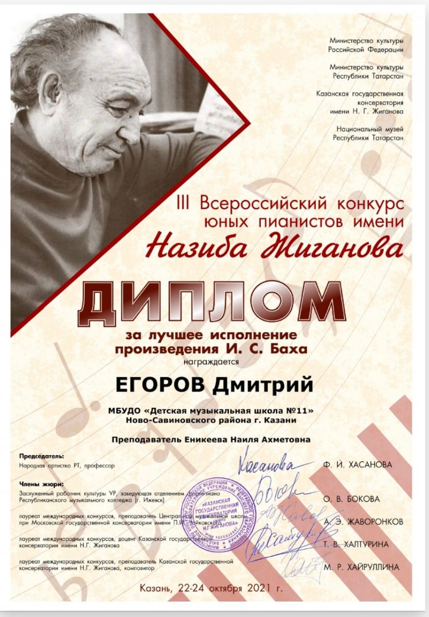 Учащийся ДМШ №11 Дмитрий Егоров (класс фортепиано, преподаватель Наиля Ахметовна Еникеева) стал Лауреатом 1 степени III Всероссийского конкурса юных пианистов имени Назиба Жиганова.