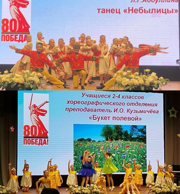 Яркие танцевальные номера («Букет полевой», «Яблонька», «Небылицы», «Рио-Рита») представили учащиеся 2-7 классов хореографического отделения (преподаватели И.В. Кириллова, В.Р. Александрова, И.О. Кузьмичёва, Л.Г. Макарова вместе с концертмейстерами Ф.А. Нигматуллиной и Л.Г. Абдуллина).
