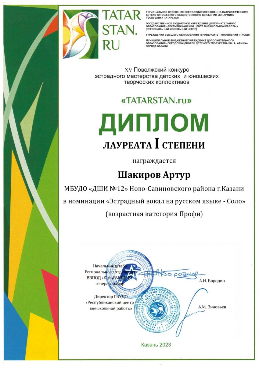 - Шакирова Артура Раисовича - Лауреата 1 степени, преподаватель вокально-хоровых дисциплин ДШИ №12 в номинации "Эстрадный вокал на русском языке - Соло" , возростная категория Профи.