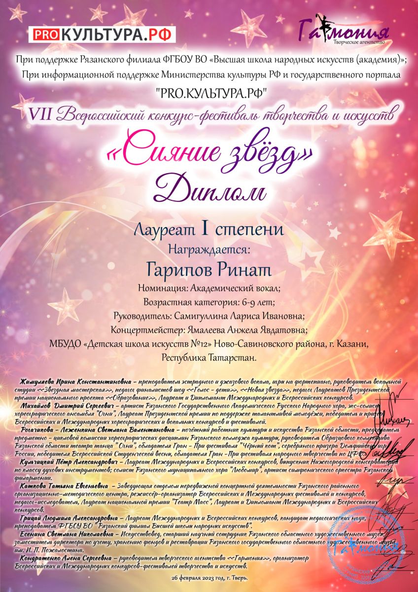 Поздравляем с успешным выступлением на VII Всероссийском конкурсе-фестивале творчества и искусств "Сияние звезд":- Гарипова Рината - Лауреата 1 степени (преподаватель Самигуллина Л.И., концертмейстер Ямалеева А.Я.) Номинация: Академический вокал. Возрастная категория: 6-9 лет.
