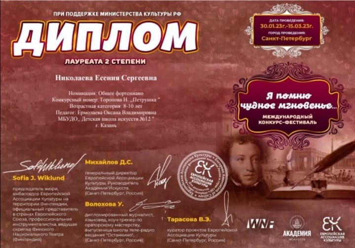 Поздравляем с успешным выступлением на Международном конкурсе-фестивале "Я помню чудное мгновение...":- Николаеву Есению - Лауреата 2 степени (преподаватель Ермолаева О.В.) в номинации Общее фортепиано, возрастная категория 8-10 лет.