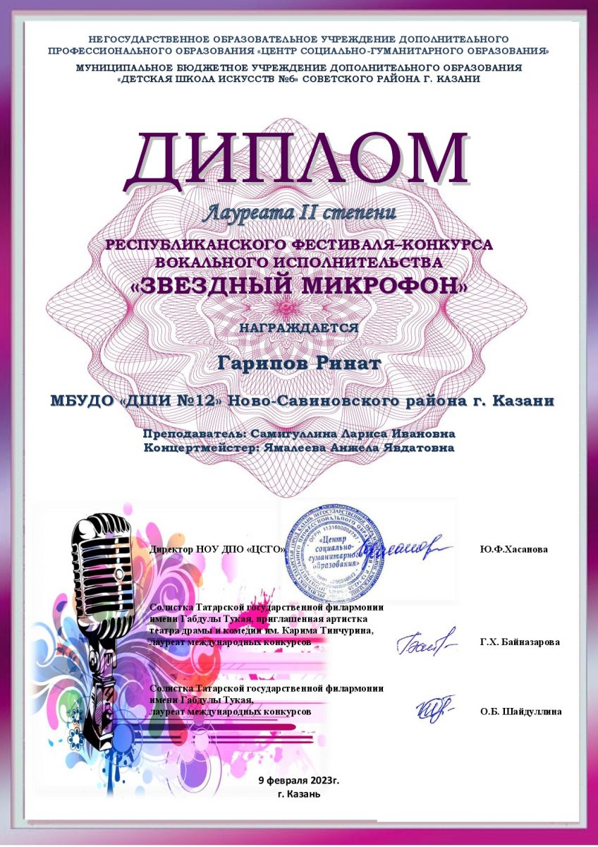 Поздравляем с успешным выступлением на Республиканском фестиваль-конкурсе вокального исполнительства "Звездный микрофон":- Гарипова Рината - Лауреата 2 степени (преподаватель Самигуллина Л.И., концертмейстер Ямалеева А.Я.)