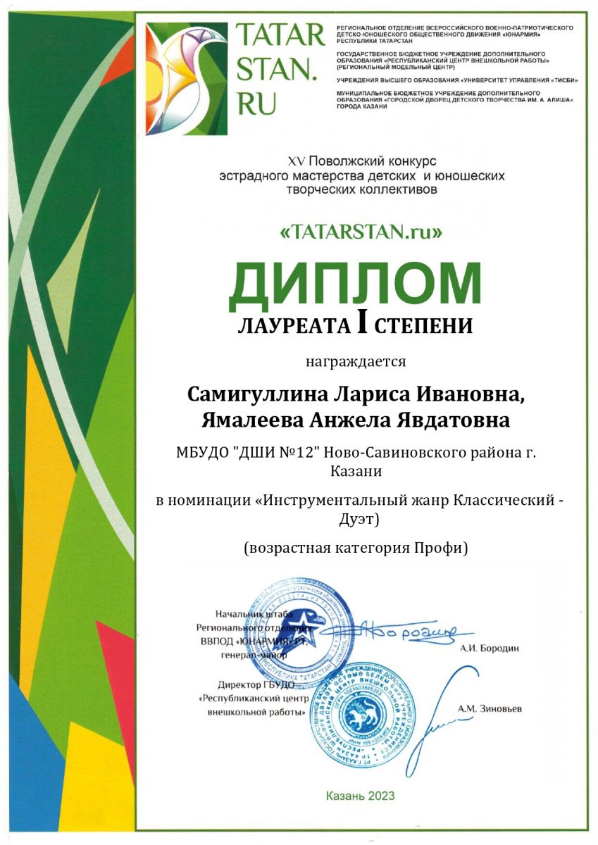- Дуэт: Самигуллина Лариса Ивановна, Ямалеева Анжела Явдатовна, педагоги ДШИ №12 в номинации "Инструметальный жанр Классический дуэт", возрастная категория Профи.