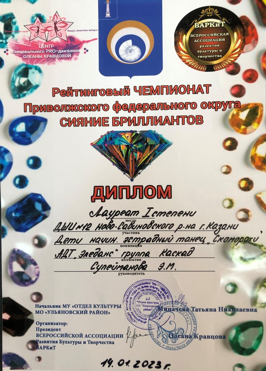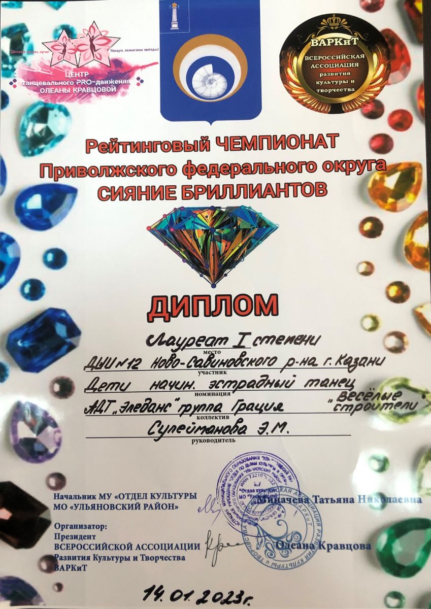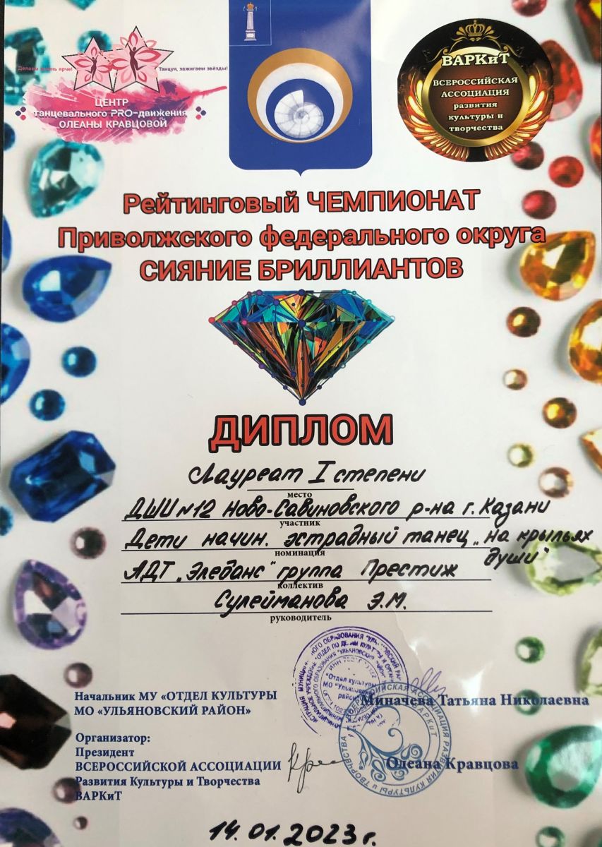 Поздравляем с успешным выступлением на Рейтинговом Чемпионате Приволжского федерального округа "Сияние бриллиантов" хореографический коллектив "Эледанс" руководителя Сулеймановой Эльвиры Миналиевны:- группа "Грация" - Лауреат 1 степени