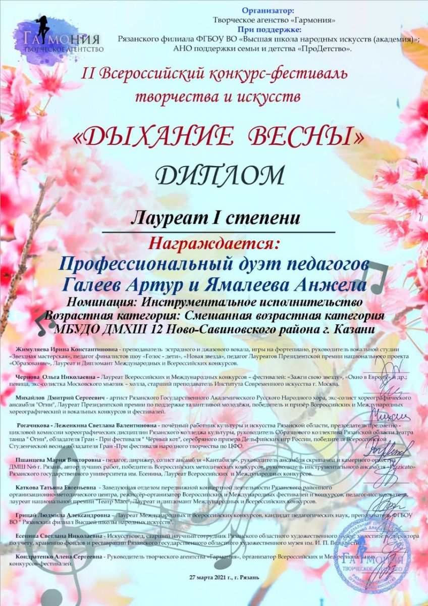 - Профессиональный дуэт педагогов : Галеева Артура Ринатовича и Ямалееву Анжелу Явдатовну - Лауреатов 1 степени, Дипломантов ГРАН - ПРИ