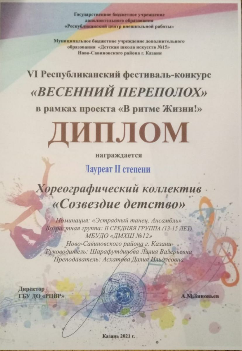 - Хореографический коллектив "Созвездие детство" - Лауреатов 2 степени (преподаватели Шарафутдинова Л.В., Асхатова Д.И.), номинация: "Эстрадный танец, Ансамбль", 2 средняя группа (13-15 лет)