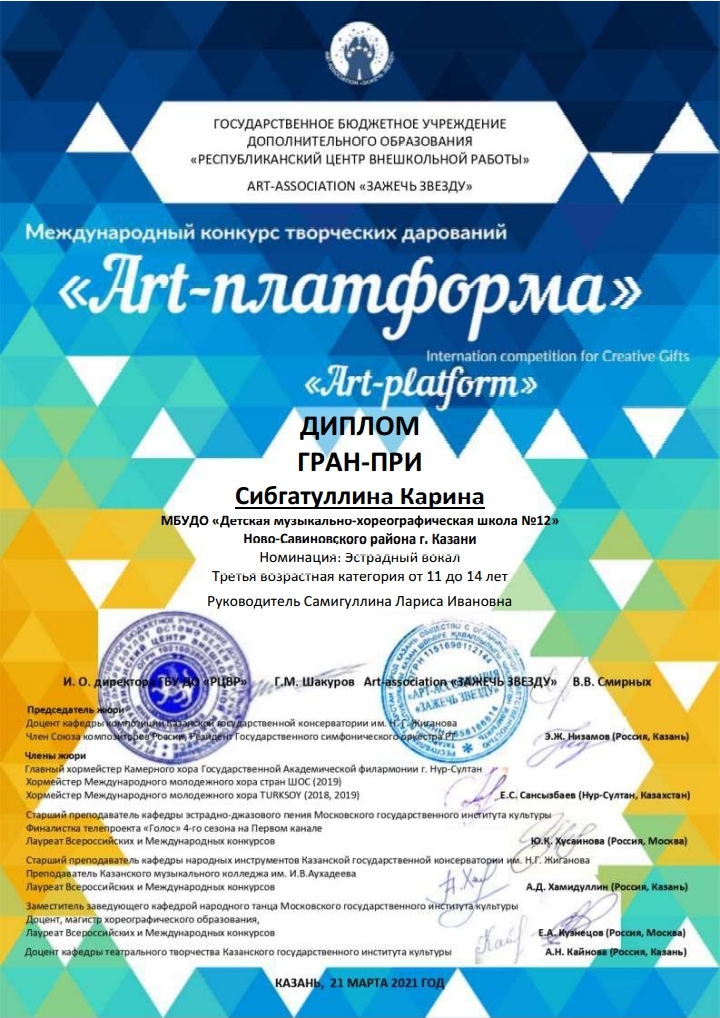 Поздравляем с успшным выступлением на Международном конкурсе творческих дарований "Art-платформа":- Сибгатуллину Карину - Дипломанта ГРАН-ПРИ (преподаватель Самигуллина Л.И.), номинация: Эстрадный вокал, 11-14 лет.