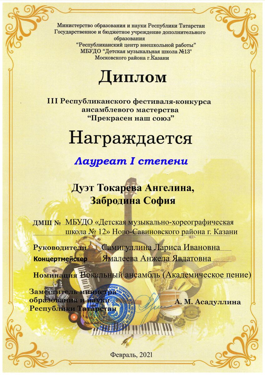 Поздравляем с успешным выступлением на III Республиканском фестиваль-конкурсе ансамблевого мастерства "Прекрасен наш союз":- Дуэт: Токарева Ангелина, Забродина София - Лауреаты 1 степени (преподаватель Самигуллина Л.И., концертмейстер Ямалеева А.Я.)