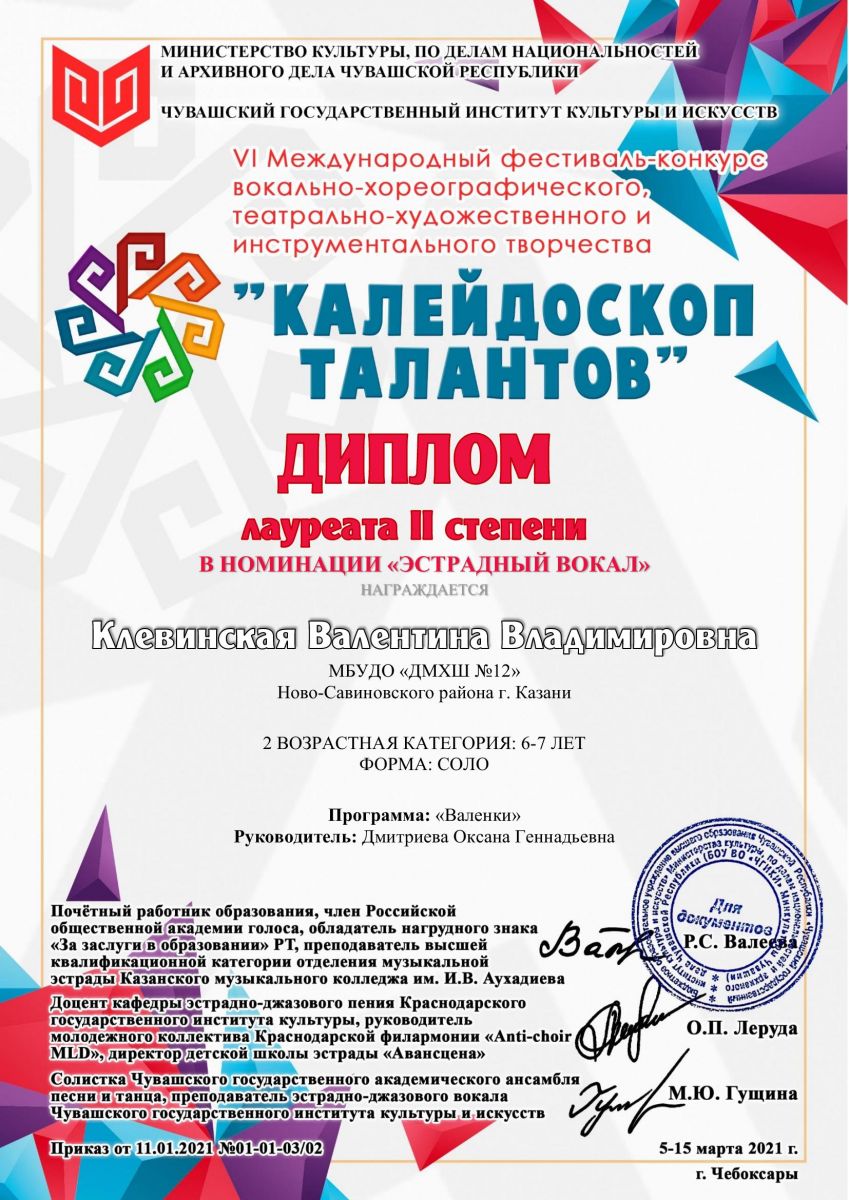 Поздравляем с успешным выступлением на VI Международном фестиваль-конкурсе вокально-хореографического, театрально-художественного и инструментального творчества "Калейдаскоп талантов":- Клевинскую Валентину - Лауреата 2 степени (преподаватель Дмитриева О.Г.)