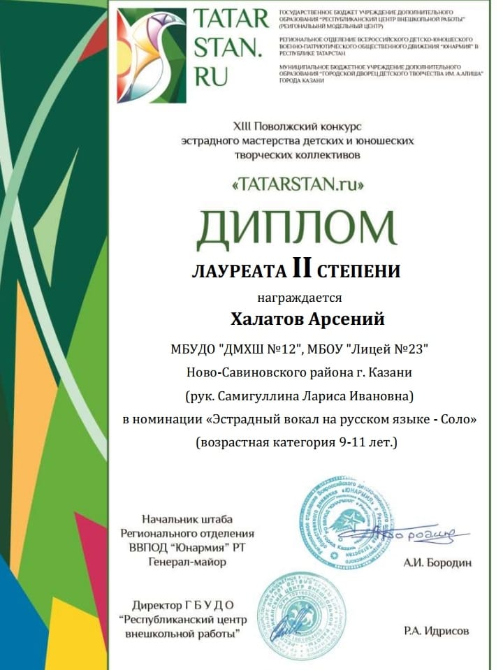 -Халатова Арсения - Лауреата 2 степени (преподаватель Самигуллина Л.И.) в номинации "Эстрадный вокал на русском языке - Соло", 9-11 лет