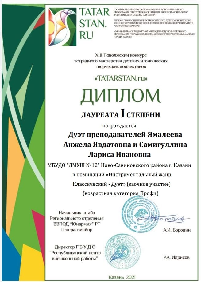 - Дуэт преподавателей: Ямалееву Анжелу Явдатовну и Самигуллину Ларису Ивановну - Лауреатов 1 степени в номинации "Инструментальный жанр Классический - Дуэт", Профи.