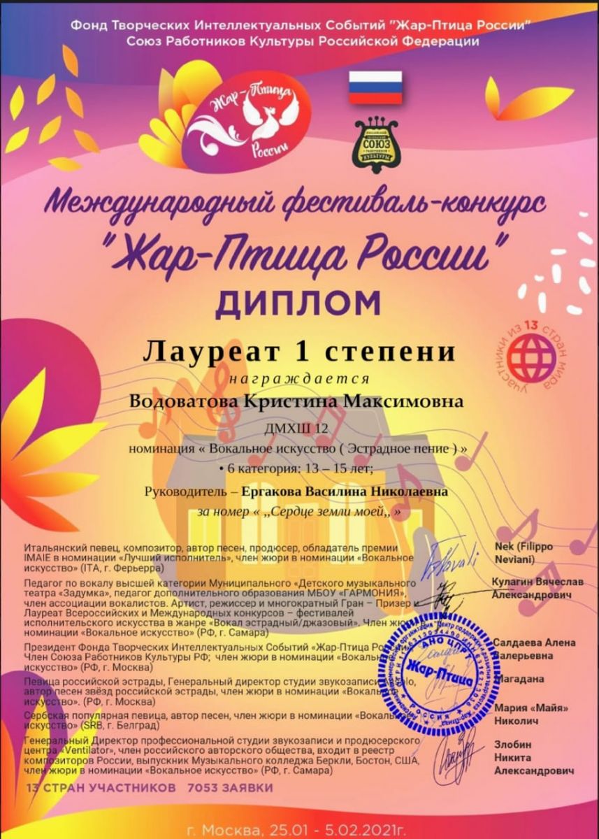 Поздравляем с успешным выступлением на Международном фестиваль-конкурсе "Жар-Птица России"- Водоватову Кристину - Лауреата 1 степени (преподаватель Ергакова В.Н.)