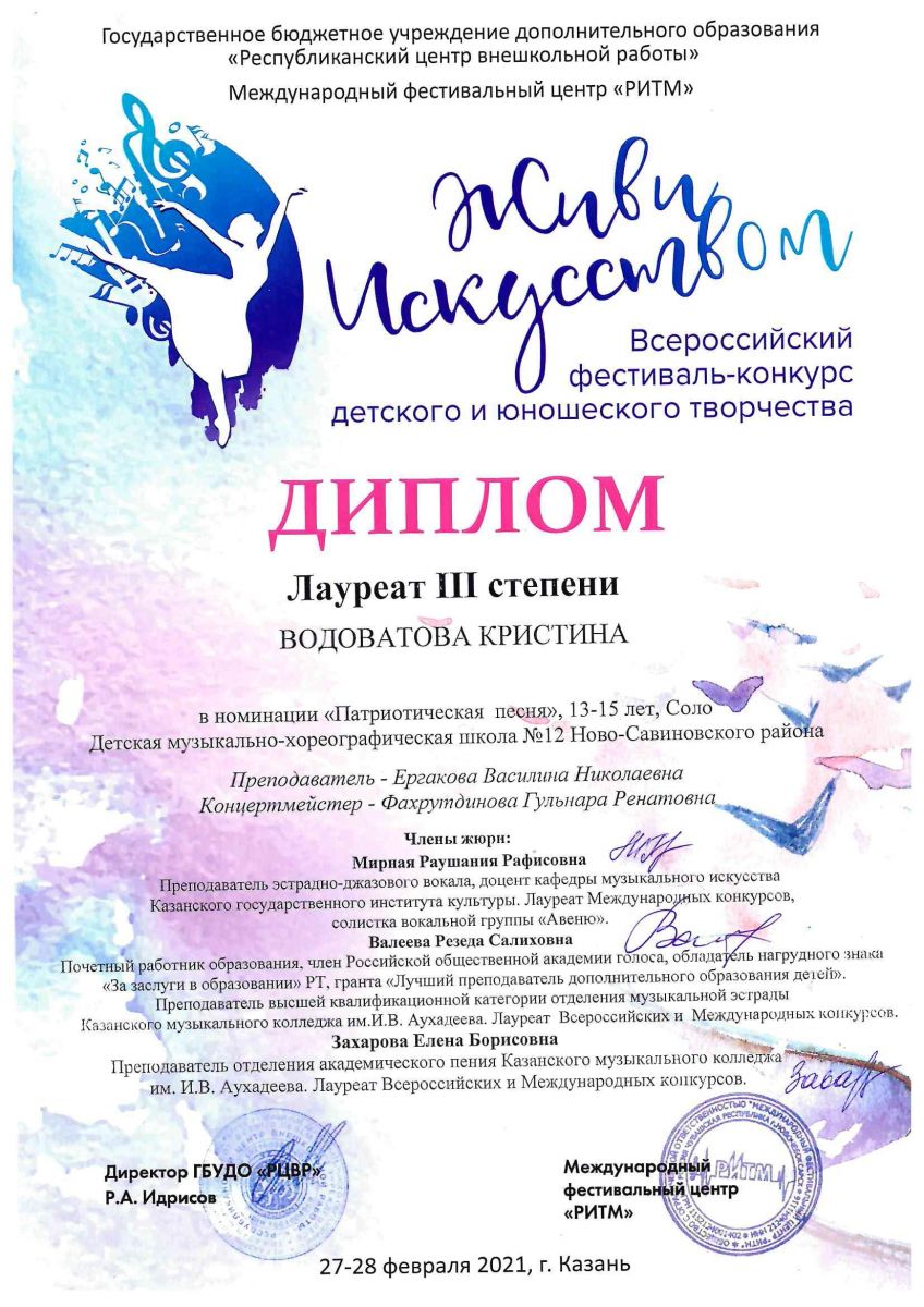Поздравляем с успешным выступлением на Всероссийском фестиваль-конкурсе детского и юношеского творчества "Живи искусством"- Водоватову Кристину - Лауреата 3 степени (преподаватель Ергакова В.Н.)