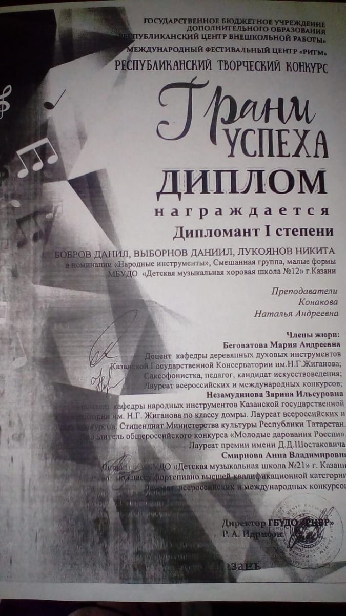 Поздравляем с успешным выступлением на Республиканском творческом конкурсе "Грани успеха" хореографический коллектив "Искорки" - Лауреатов 3 степени (преподаватель Егорова М.И.), Ансамбль гитаристов - Дипломантов 1 степени (преподаватель Конакова Н.А.).