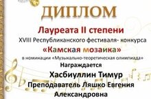 Поздравляем с успешным выступлением на XVIII Республиканском фестиваль-конкурсе "Камская мозаика" в номинации "Музыкально-теоретическая олимпиада":