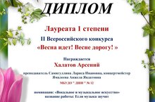 - Халатова Арсения - Лауреата 1 степени в номинации "Вокал" (академический вокал), 12-14 лет. Преподаватель Самигуллина Л.И., концертмейстер Ямалеева А.Я.