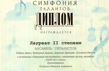 Лауреатов 2 степени - Ансамбль гитаристов: Боброва Данила, Выборного Даниила, Доронина Дмитрия, Лукоянова Никиту (преподаватель Конакова Н.А.)
